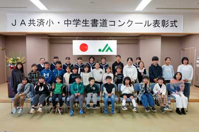 当JAはこのほど、本店でJA共済小・中学生書道コンクール表彰式を開きました。 JA審査および県コンクールで入賞者した児童生徒とそ…
