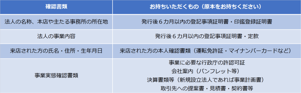 審査のためお持ちいいただくものは次のとおりです。口座開設の際は改めてご来店いただき、当組合所定の口座開設申込書等の記入をお願いいたします。
