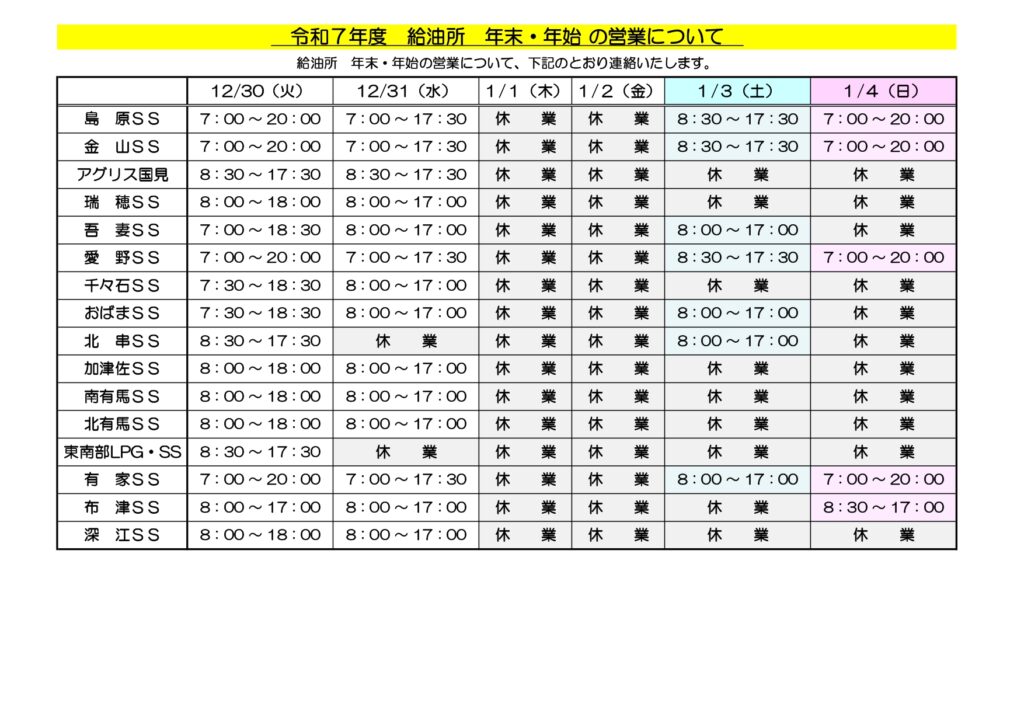 年末年始における給油所の営業時間の変更についてご案内いたします。
