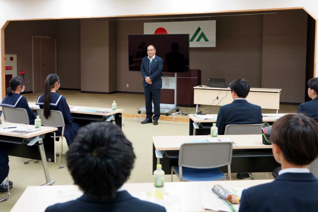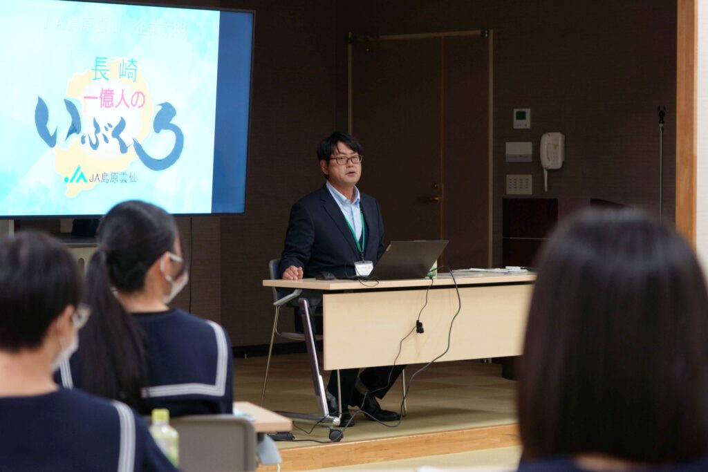 同校が行う島原半島内企業見学会の一環で、JAの事業内容や取り組みについて説明を受けました。 この見学会は、地元の産業や企業について知り、実際に働くイメージを持ってもらうことを目的に毎年開催されています。