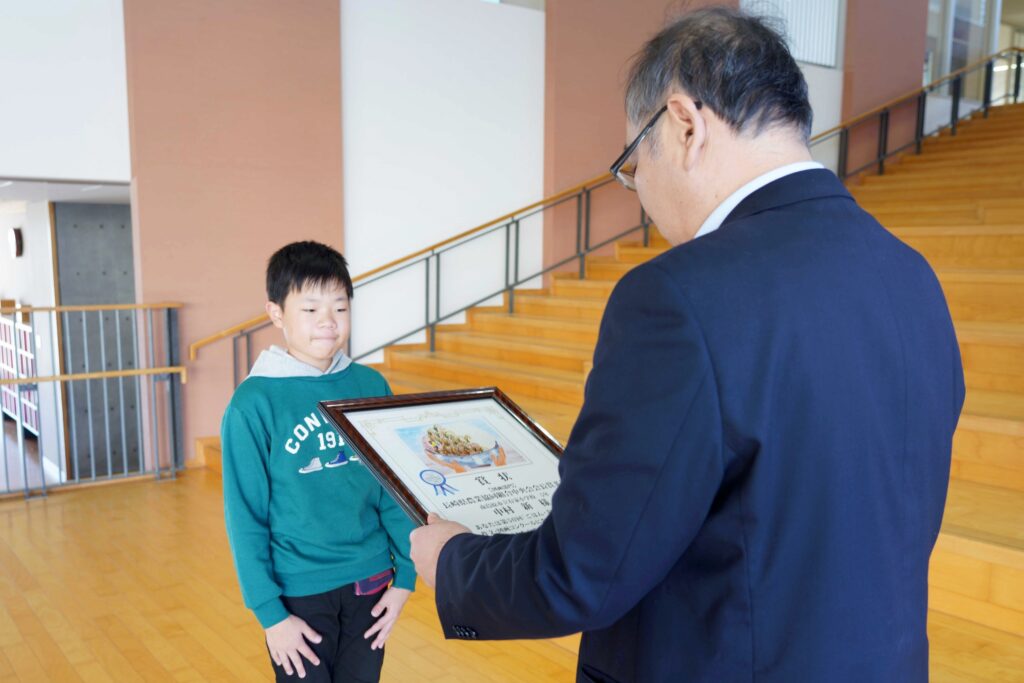 12月中旬、長崎県農業協同組合中央会会長賞を受賞した南島原市立有家小学校の中村新さんに、有家支店の中島剛支店長から表彰状と副賞が贈られました。